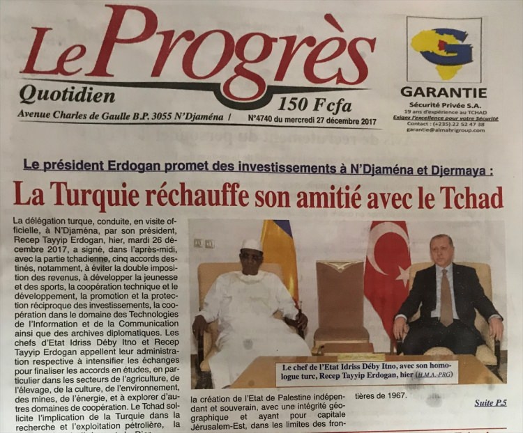 Ülkenin günlük yayınlanan gazetesi Le Progres da "Türkiye, Çad ile arasındaki dostluğu ısıttı" manşetini atarak Erdoğan'ın, Çad'a havalimanı inşası ve köprü yapımı dahil birçok alanda yatırım yapma sözü verdiğini okuyucularıyla paylaştı.