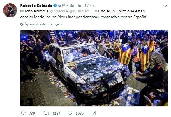 Katalan protestocular tarafından hurdaya çevrilen bir polis aracı fotoğrafı paylaşan Soldado, resmin altına 'O politikacıların amacı İspanya'ya karşı öfke yaratmak ve kışkırtmak' diye yazdı.