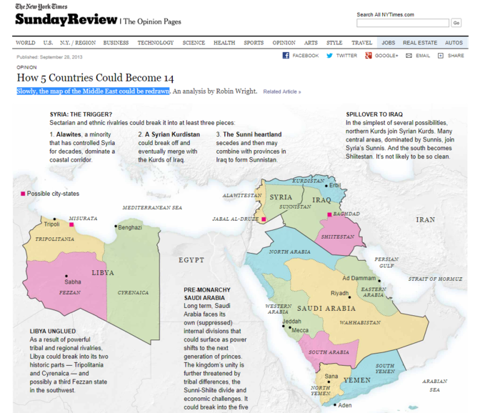 New York Times'ın 4 yıl önce yayımlamış olduğu 28 Eylül 2013 tarihli Robin Wright imzalı analizde Ortadoğu’da 5 devletin nasıl 14 devlete çıkacağı anlatılıyor. “Yavaş yavaş Ortadoğu'nun haritası yeniden çizilebilir” analizinde Suudi Arabistan, Yemen, Suriye, Irak, Libya gibi ülkelerin bir kaç parçaya ayrıldığı görülüyor.