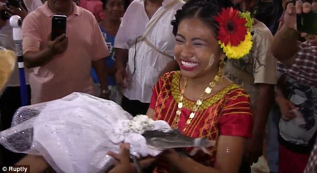 İlginç düğün töreninde ağzı bağlı yavru timsaha gelinlik giydirildi. Söz konusu geleneğe göre balıkçılara şans getirmesi için bölgenin belediye başkanının her yıl bir timsahla evlenmesi talep ediliyor.