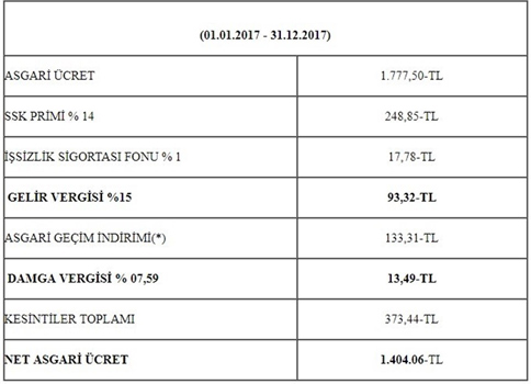 Asgari ücret, halen bekar bir işçi için brüt bin 777 lira 50 kuruş, vergiler ve kesintiler düştüğünde net bin 404 lira 6 kuruş olarak uygulanıyor. Apartman görevlileri için ise normal işçilerden farklı olarak gelir ve damga vergileri kesilmediğinden net bin 510 lira 87 kuruş olarak hesaplanıyor.