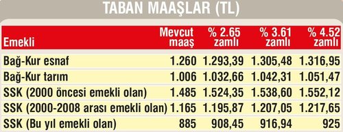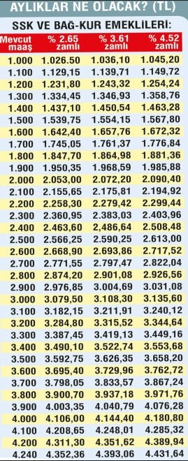 TAKVİM, bu tahminlere göre yeni maaşları hesapladı. Halen en düşük Bağ-Kur esnaf emeklisi aylığı bin 260 lira seviyesinde bulunuyor. Bu maaş Ocak zammı yüzde 2.65 olursa bin 293, yüzde 3.61 olursa bin 305, yüzde 4.52 olursa bin 316 liraya yükselecek. En düşük SSK aylığı ise 2000'den önce emekli olanlarda bin 485 lira seviyesinde bulunurken; Ocak artışı yüzde 2.65 olursa bin 524, yüzde 3.61 olursa bin 538, yüzde 4.52 olursa bin 552 liraya ulaşacak. Halen 4 bin 240 lira olan en yüksek emekli maaşı da zam oranı yüzde 2.65 olursa 4 bin 352, yüzde 3.61 olursa 4 bin 393, yüzde 4.52 olursa 4 bin 431 liraya çıkacak.