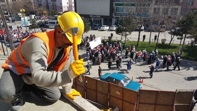 inşaat işçileri, korteji yüksekten izleyerek keser ve baretlerini sallayarak göstericileri selamladı.