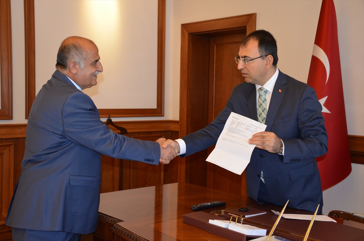 Malatya TSO Başkanı Hasan Hüseyin Erkoç ve yönetim kurulu üyeleri, Vali Mustafa Toprak'ı ziyaret ederek, 75 liralık makbuzun bir örneğini kendisine verdi.