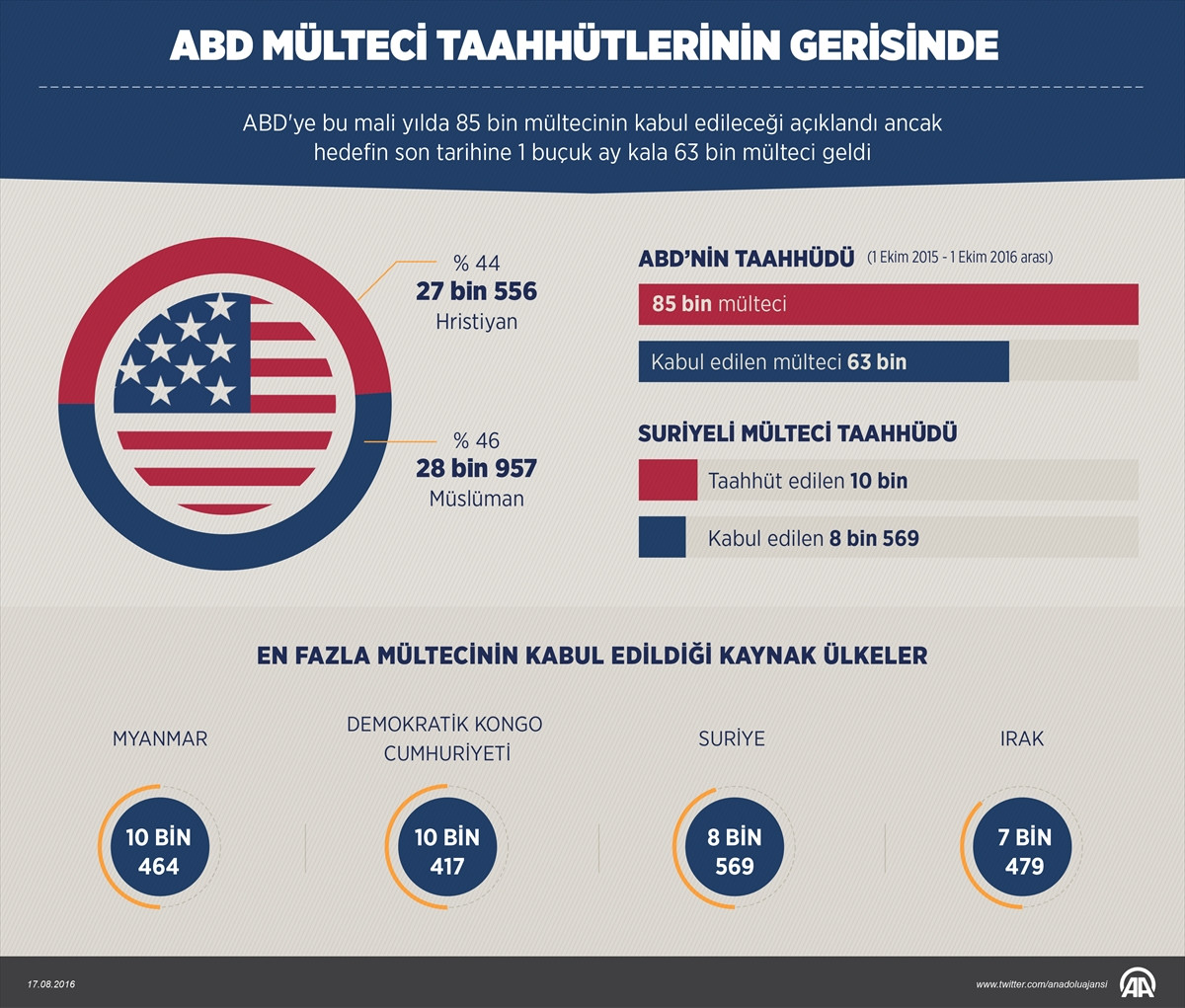 ABD'ye gelen Müslüman mültecilerin büyük bölümünün, Suriye ile Somali vatandaşları olduğu kaydedildi. Suriye'den 8 bin 511, Somali'den de 7 bin 234 Müslüman mülteci ABD'ye geldi. Yine bu mali yılda Irak'tan 6 bin 71, Myanmar'dan 2 bin 554, Afganistan'dan bin 948 ve diğer ülkelerden 2 bin 639 Müslüman, mülteci konumunda ABD'ye giriş yaptı.