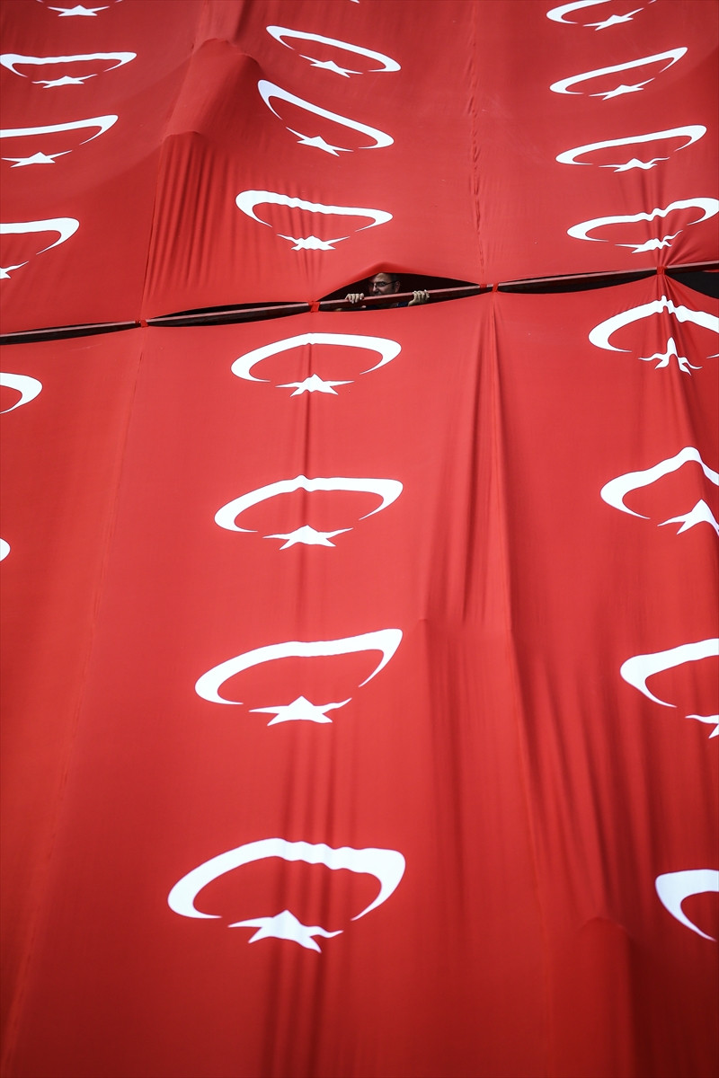 Beştepe'de Cumhurbaşkanlığı Külliyesi çevresinde toplanarak AK Parti Genel Merkezi'ne doğru yürüyüşe başlayan yaklaşık 6 bin vatandaş, 4 metre eninde, 1 kilometre uzunluğunda dev Türk bayrağı taşıdı.