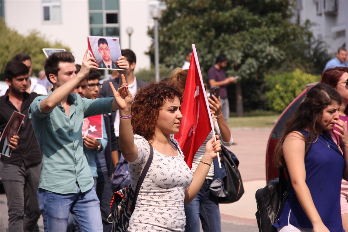 Akdeniz Üniversitesi Yerleşkesindeki Yakut Çarşı önünde toplanan grup, ellerinde şehitlere ait fotoğraflar ve Türk bayraklarıyla yürüyüşe geçti. Grup, sloganlar eşliğinde Olbia Çarşısı'na kadar yürüdü.