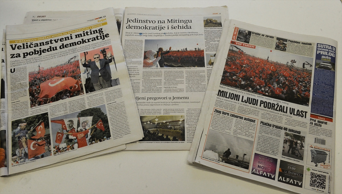 Oslobodjenje gazetesi, "Demokrasi ve Şehitler Mitingi'nde Birlik" başlığıyla yayınladığı haberde, mitingin "başarısız darbe girişiminin ardından gözaltılar nedeniyle Batı'nın eleştirilerine maruz alan Erdoğan için de güç gösterisi" olduğunu ifade etti.