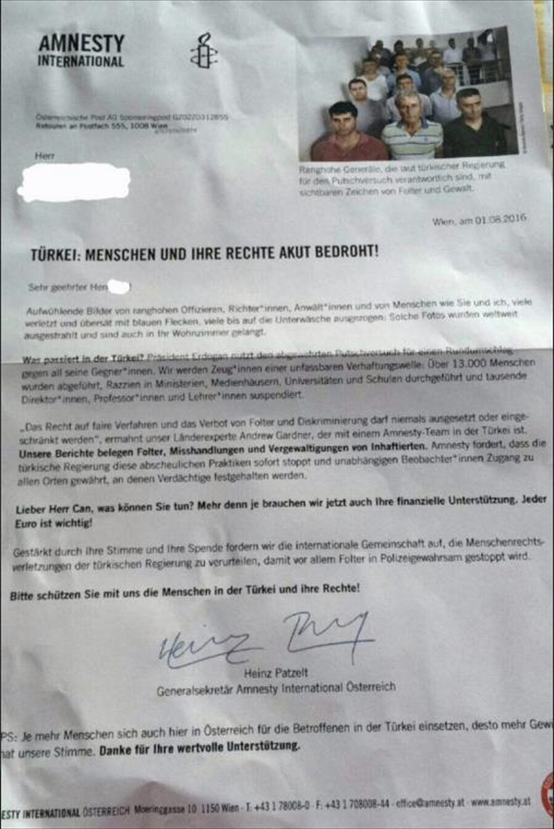 Uluslararası Af Örgütü Avusturya Şubesi'nden isminin verilmesini istemeyen bir kişi, AA muhabirinin sorusu üzerine, darbecilere yardım toplamak amacıyla üyelerine ve derneklere içerisinde ödeme makbuzlarının bulunduğu mektubu yolladıklarını doğruladı.