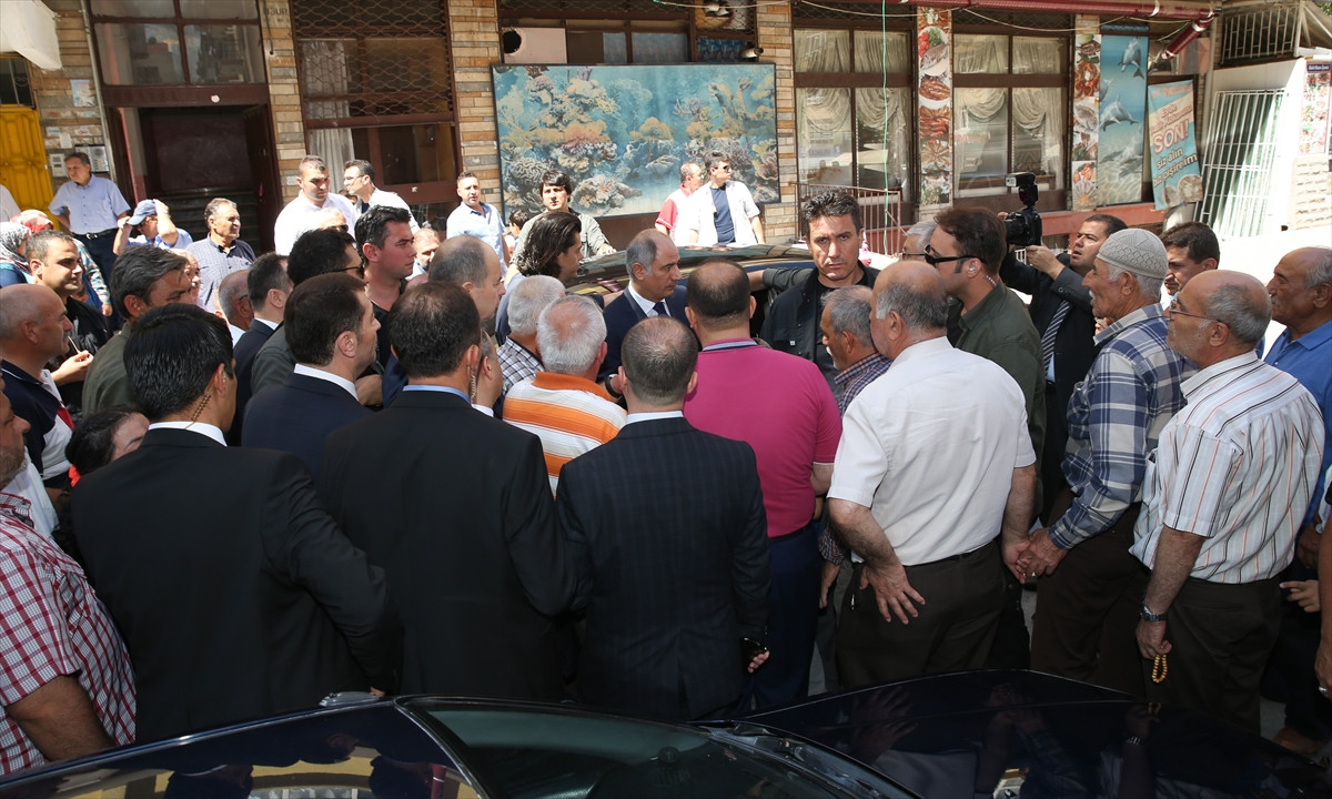 Bakan Ala, camiye gelişinde şehidin babası İsmail Başayar'a sarılırken, diğer vatandaşlarla da tokalaşarak selamlaştı.