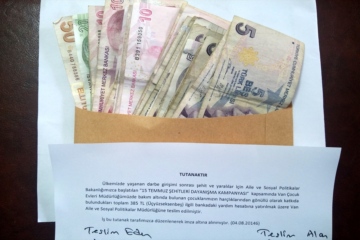 VAN (AA) - Van'da, Aile ve Sosyal Politikalar Müdürlüğüne bağlı çocuk evlerinde bakım altında bulunan çocuklar, "15 Temmuz Şehitleri Dayanışma Kampanyası"na harçlıklarıyla katkıda bulundu.