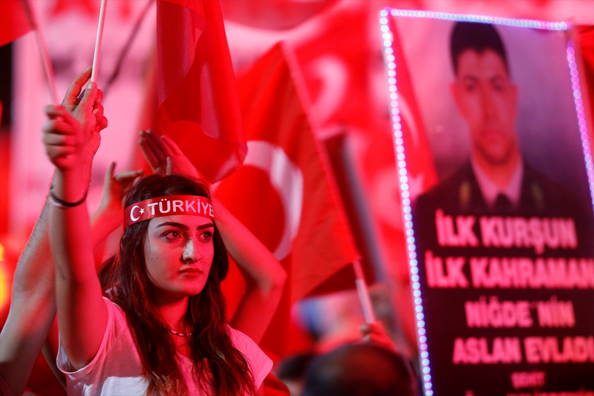 Demokrasi nöbetinin sürdüğü Kızılay Meydanı'nda da kadın-erkek, yaşlı-genç binlerce vatandaş ellerinde Türk bayrakları ile İngilizce ve Türkçe pankartlar taşıdı.