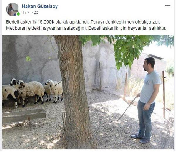 Güzelsoy, sosyal medya hesabından, 'Bedelli askerlik 15 bin TL olarak açıklandı. Parayı denkleştirmek oldukça zor. Mecburen eldeki hayvanları satacağım. Bedelli askerlik için hayvanlar satılıktır' yazılı notu paylaştığı görüldü.