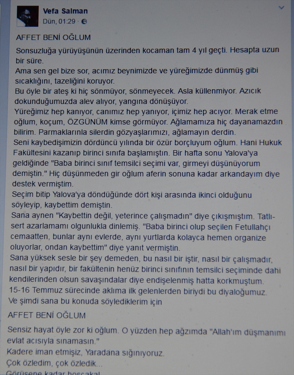 YALOVA (AA) - Yalova Belediye Başkanı Vefa Salman, 4 yıl önce geçirdiği trafik kazası sonucu yaşamını yitiren oğlu Özgün Salman'dan, Fetullahçı Terör Örgütü/Paralel Devlet Yapılanması (FETÖ/PDY) konusunda Facebook hesabından özür diledi.