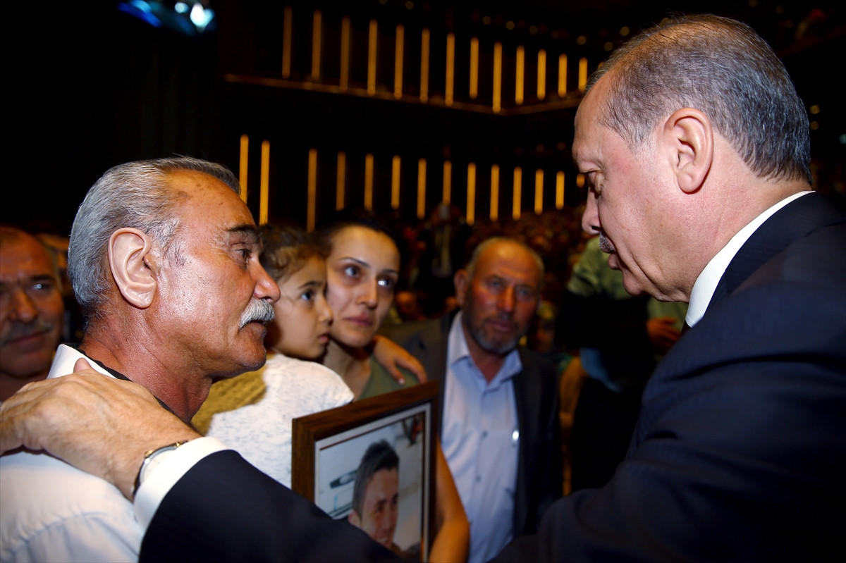 Erdoğan, 15 Temmuz gecesi sadece Ankara'da, İstanbul'da değil dünyanın farklı bölgelerinde, pek çok şehirde yüz milyonlarca insanın kalbinin Türkiye için attığına işaret ederek, "Elleri bizim için semaya kalkıyordu. Aman ya Rabb o ne güzellik. Bu millet, dünyada farklı yere oturdu. Her yerden size selamlar var, dualar var. Bu insanlar, Türkiye'deki mücadelenin 79 milyonla birlikte kendi istiklal ve istikbal mücadeleleri olduğunu biliyordu. Ülkemize husumet besleyenler, teröristlerini üzerimize salanlar, kendilerini dev aynasında görebilirler ama bu milletin arkasında çok daha büyük bir güç, çok daha büyük bir destek var. O da mazlumların duasıdır."