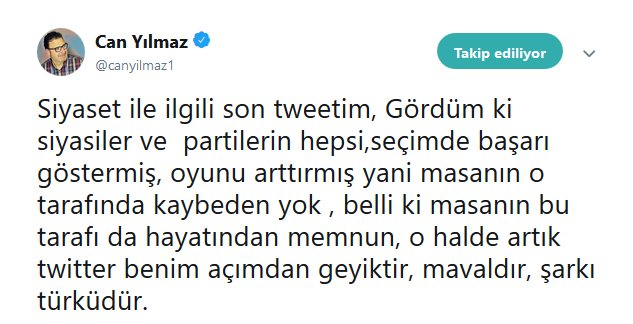 Sosyal medya hesabını projeler ve espriler dışında siyasi hayata dair göndermeler yaparak da değerlendiren Can Yılmaz, geride bıraktığımız seçim sonrasında dikkat çekici bir karara imza attı. Seçim sonrasında partilerin ve liderlerin verdiği tepkiler üzerinden bir değerlendirmede bulunan Yılmaz şunları yazdı: “Siyaset ile ilgili son tweetim, gördüm ki siyasiler ve partilerin hepsi, seçimde başarı göstermiş, oyunu artırmış yani masanın o tarafında kaybeden yok, belli ki masanın bu tarafı da hayatından memnun, o halde artık twitter benim açımdan geyiktir, mavaldır, şarkı türküdür.”