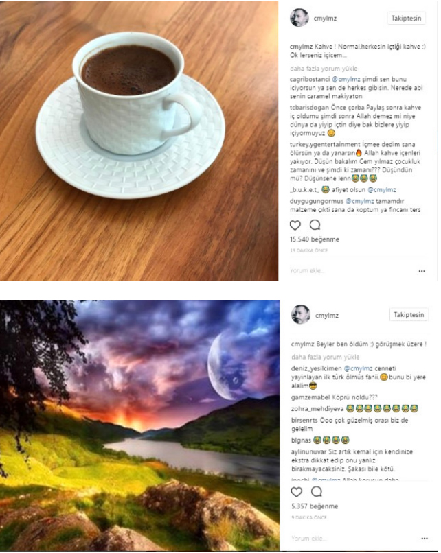 Daha sonrada kahve içtiği anın videosunu çekti. Hemen ardından da yeşillik fotoğrafı paylaşıp " Beyler ben öldüm, görüşmek üzere" yazdı.