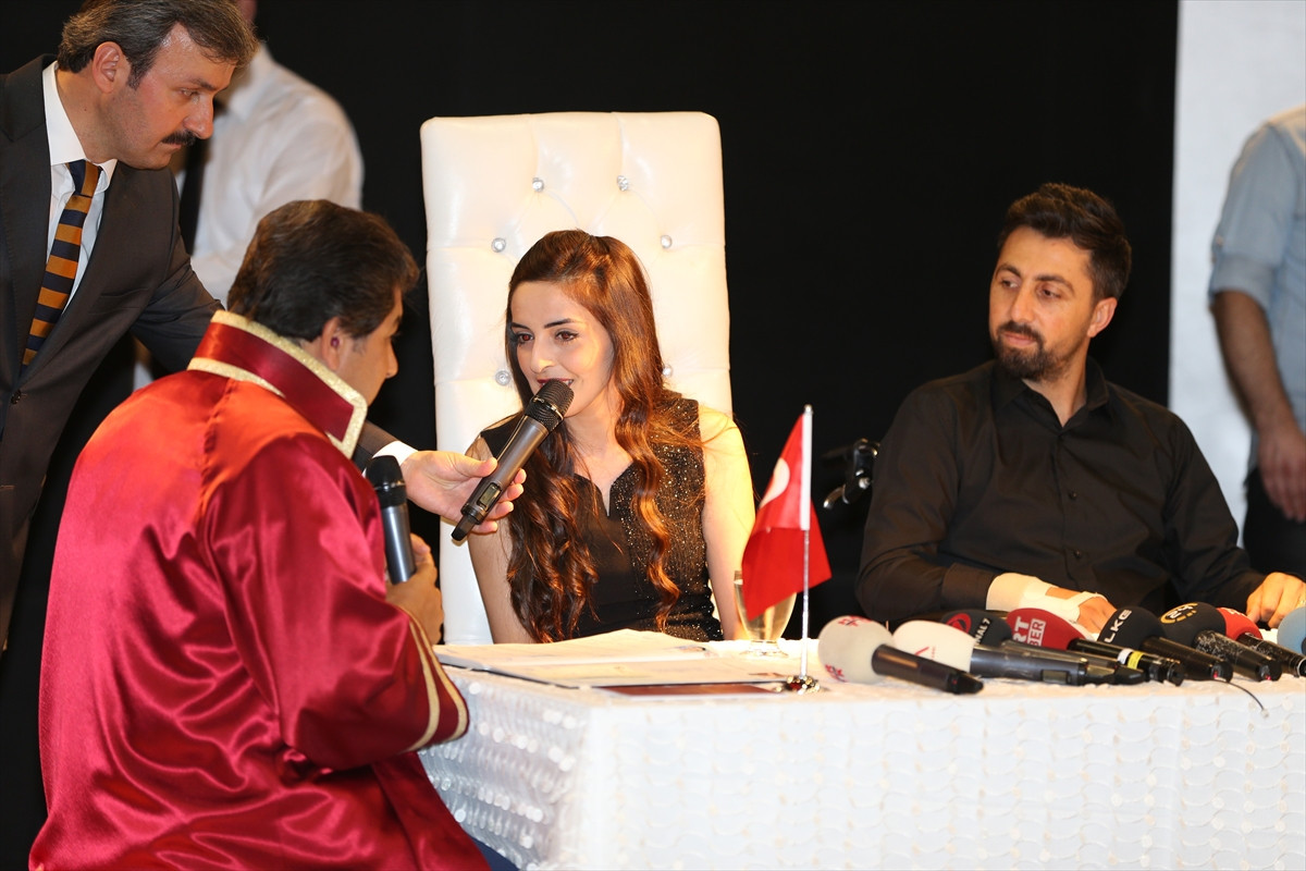 Tören için tedavisinin devam ettiği odasından nişanlısı Demir ve yakınlarının eşliğinde salona giden Akyün'ün tekerlekli sandalyeyle getirildiği görüldü.