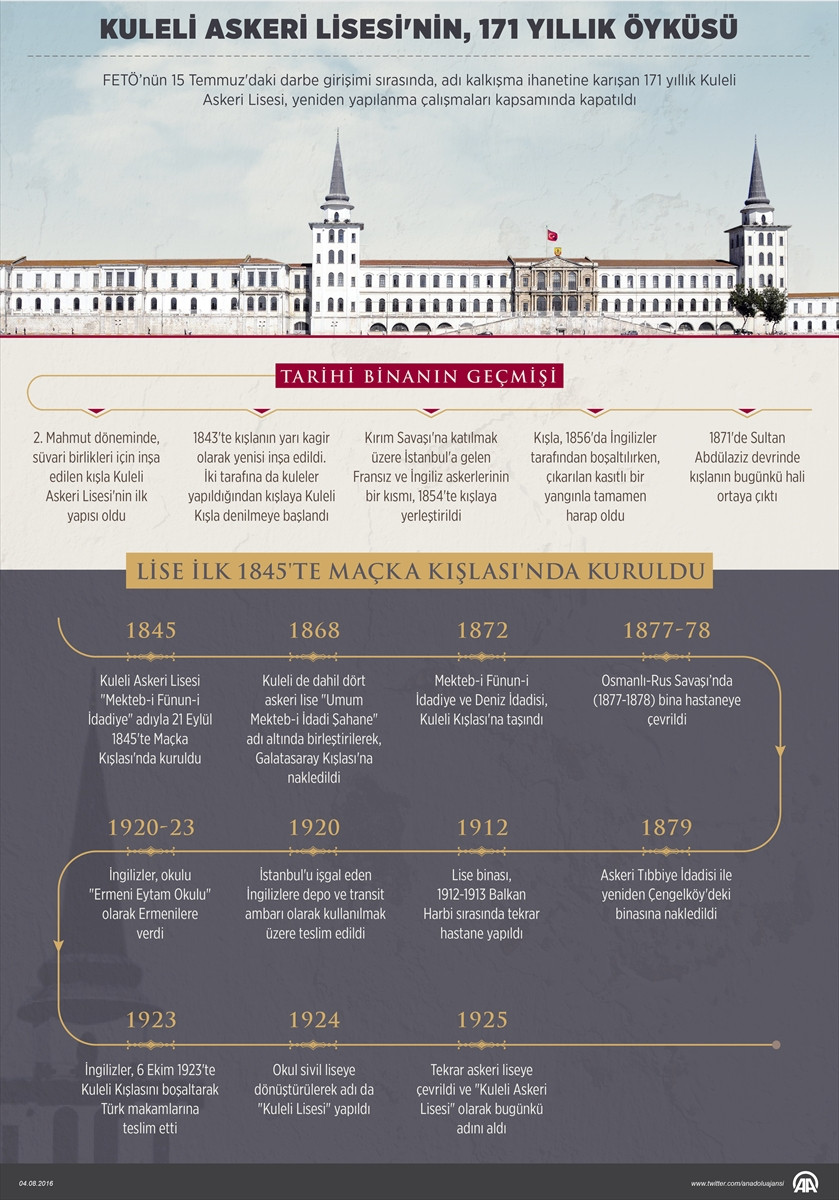 İSTANBUL (AA) - HANİFE SEVİNÇ - Fetullahçı Terör Örgütü'nün (FETÖ) 15 Temmuz'daki darbe girişimi sırasında, adı kalkışma ihanetine karışan 171 yıllık Kuleli Askeri Lisesi, yeniden yapılanma çalışmaları kapsamında kapatıldı.Resmi Gazete'de yayımlanan 669 sayılı Olağanüstü Hal Kapsamında Bazı Tedbirler Alınması ve Milli Savunma Üniversitesi Kurulması ile Bazı Kanunlarda...