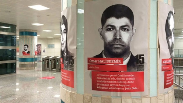 Yenikapı'da metro istasyonunun duvarlarında darbe şehitlerinin fotoğrafları asıldı.