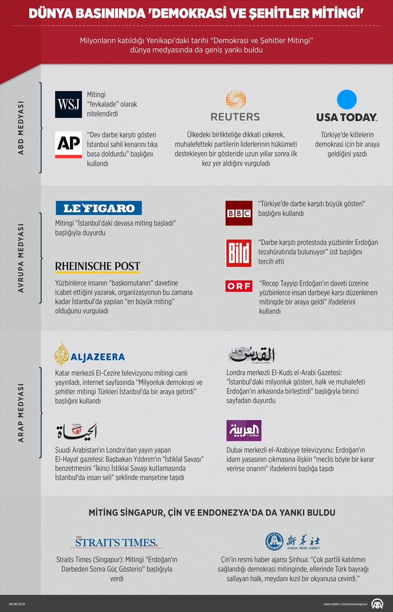 Singapur'un Straits Times gazetesinin internet sayfasında, "Erdoğan'ın Darbeden Sonra Güç Gösterisi" başlığıyla verilen haberde, mitinge bir milyon kişinin katıldığı, Cumhurbaşkanı Erdoğan'ın Türkiye'yi FETÖ'den kurtarılacağı sözünü verdiği belirtildi.