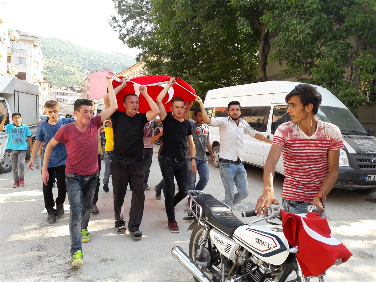 DÜZCE (AA) - Diyarbakır'ın Silvan ilçesindeki baraj inşaatının güvenliğini sağlayan askerlere terör örgütü PKK mensuplarınca düzenlenen roketatarlı saldırıda şehit düşen Jandarma Astsubay Metin Uysal'ın acı haberini alan vatandaşlar, Düzce'de yürüyüş gerçekleştirdi.