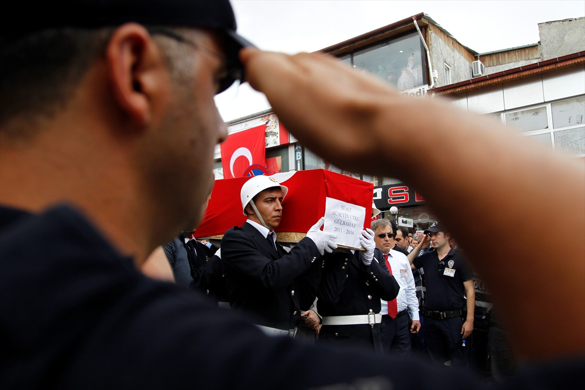 Konvoy eşliğinde Ulu Cami'ye getirilen cenazeler, polislerin omuzlarında katafalka konuldu.