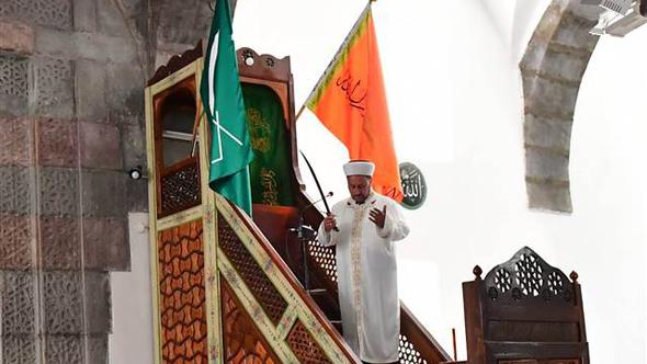 Niksar’da 1145 yılında yaptırılan tarihi Ulu Cami’de minbere çıkan İlçe Müftüsü Ali Canpolat, eline kılıç alarak hutbeyi okudu.