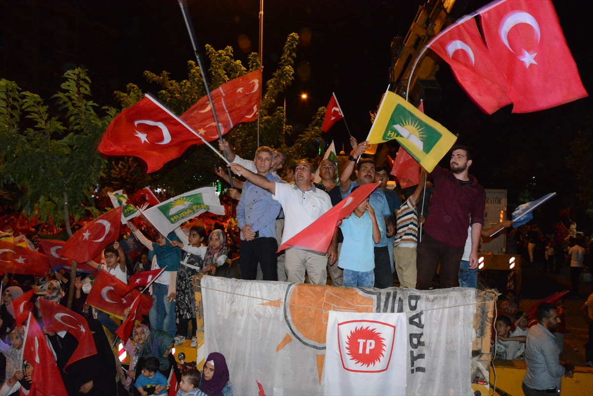 Alanda demokrasi nöbetinde bekleyen binlerce kişi sık sık, "İşte ordu işte komutan", "Hainler halka hesap verecek", "Dik dur eğilme Batman seninle", "Şehitler ölmez vatan bölünmez", "Darbeler tutmaz ezanlar susmaz" sloganları attı.