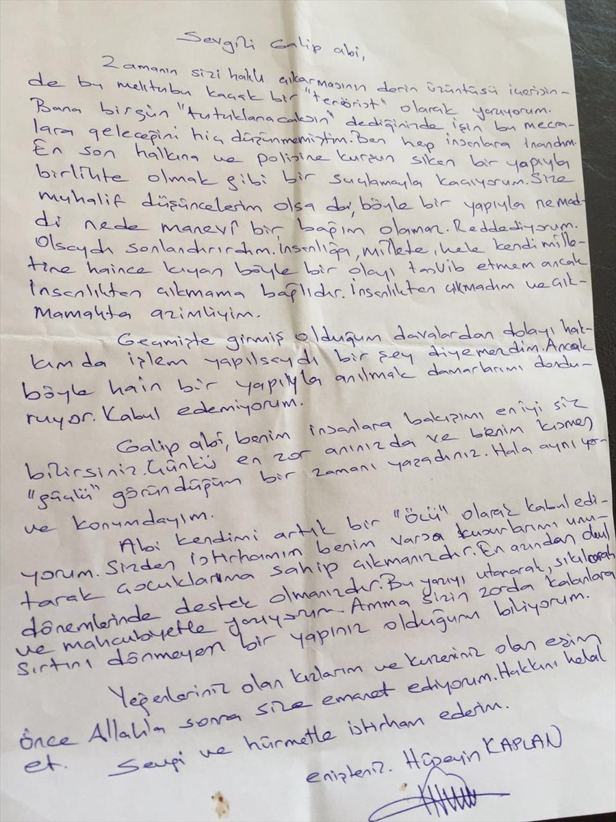 Abi kendimi artık bir 'ölü' olarak kabul ediyorum. Sizden istirhamım benim varsa kusurlarımı unutarak, çocuklarıma sahip çıkmanızdır. En azından okul dönemlerinde destek olmanızdır. Bu yazıyı utanarak, sıkılarak ve mahcubiyetle yazıyorum. Ama sizin zorda kalanlara sırtınızı dönmeyen bir yapınız olduğunu biliyorum. Yeğenleriniz olan kızlarımı ve kuzeniniz olan eşimi önce Allah'a, sonra size emanet ediyorum. Hakkını helal et. Sevgi ve hürmetlerimi istirham ederim. Enişteniz Hüseyin Kaplan."
