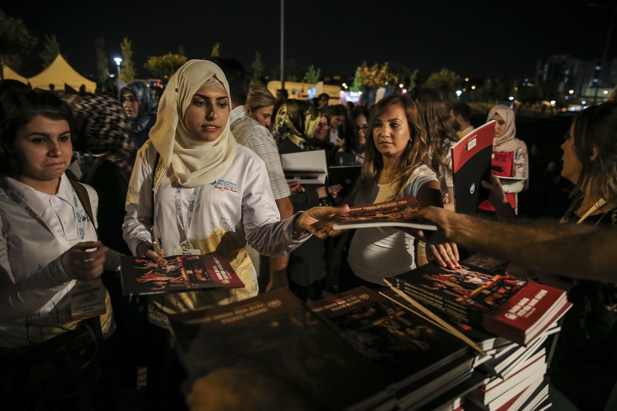 "46 ülkeden 550 genci, Türkiye'de ağırlamak üzere davet ettik. Bu darbe girişimine rağmen 500 öğrenci Türkiye'ye intikal etti. Bunlardan 180'i Ankara'da eğitim görüyor. 1 aylık yoğun Türkçe eğitimi var. Onların yoğun talebi üzerine, kendi istekleri doğrultusunda milli iradeyi göstermek için bu alanda toplanmayı tercih ettik."