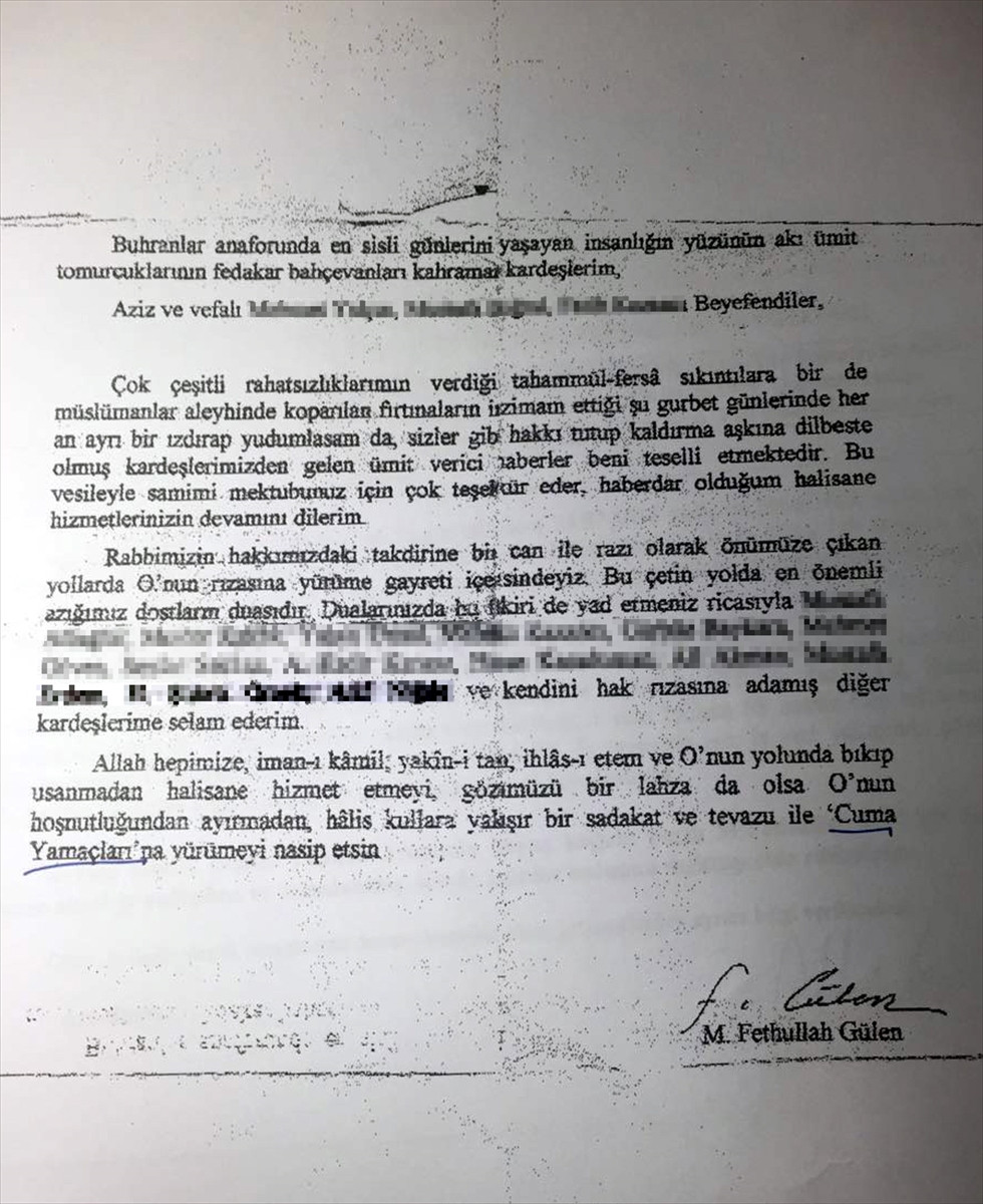 İZMİR (AA) - İzmir'in Tire ilçesinde Fetullahçı Terör Örgütü'nün (FETÖ) darbe girişimine ilişkin soruşturma kapsamında örgütle bağlantılı olduğu değerlendirilen derneğin kurucu üyesi olduğu iddiasıyla gözaltına alınan şüphelinin iş yerinde FETÖ elebaşı Fetullah Gülen imzalı yazı ele geçirildi.
