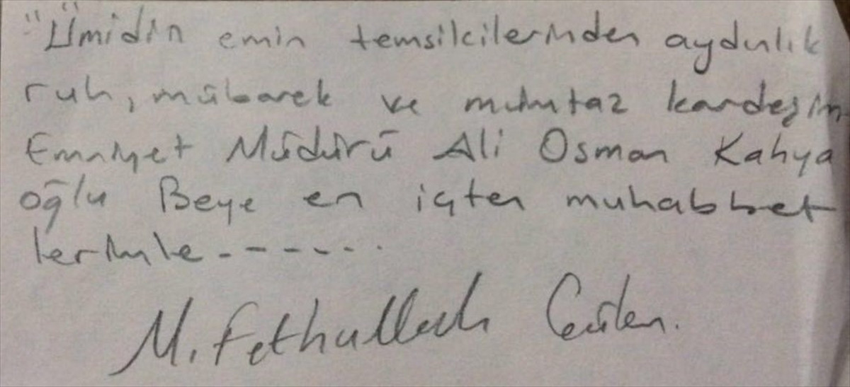 Notta, "Ümidin emin temsilcilerinden aydınlık ruh, mübarek ve mümtaz kardeşim Emniyet Müdürü Ali Osman Kahya oğlu beye en içten muhabbetlerimle... M. Fetullah Gülen." ifadelerinin yer aldığı belirtildi.