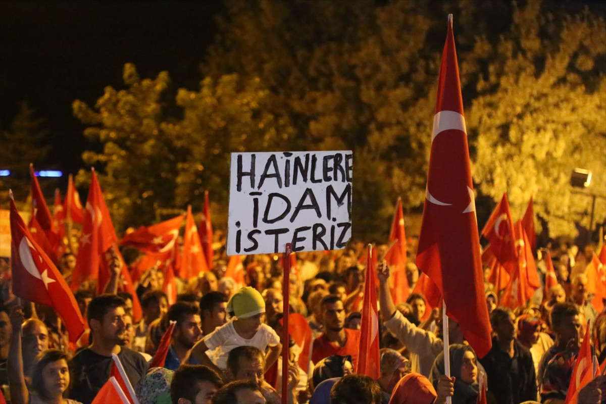 Türk bayrakları ve Cumhurbaşkanı Recep Tayyip Erdoğan'ın posterlerini taşıyan vatandaşlar, darbe girişimini protesto etti.