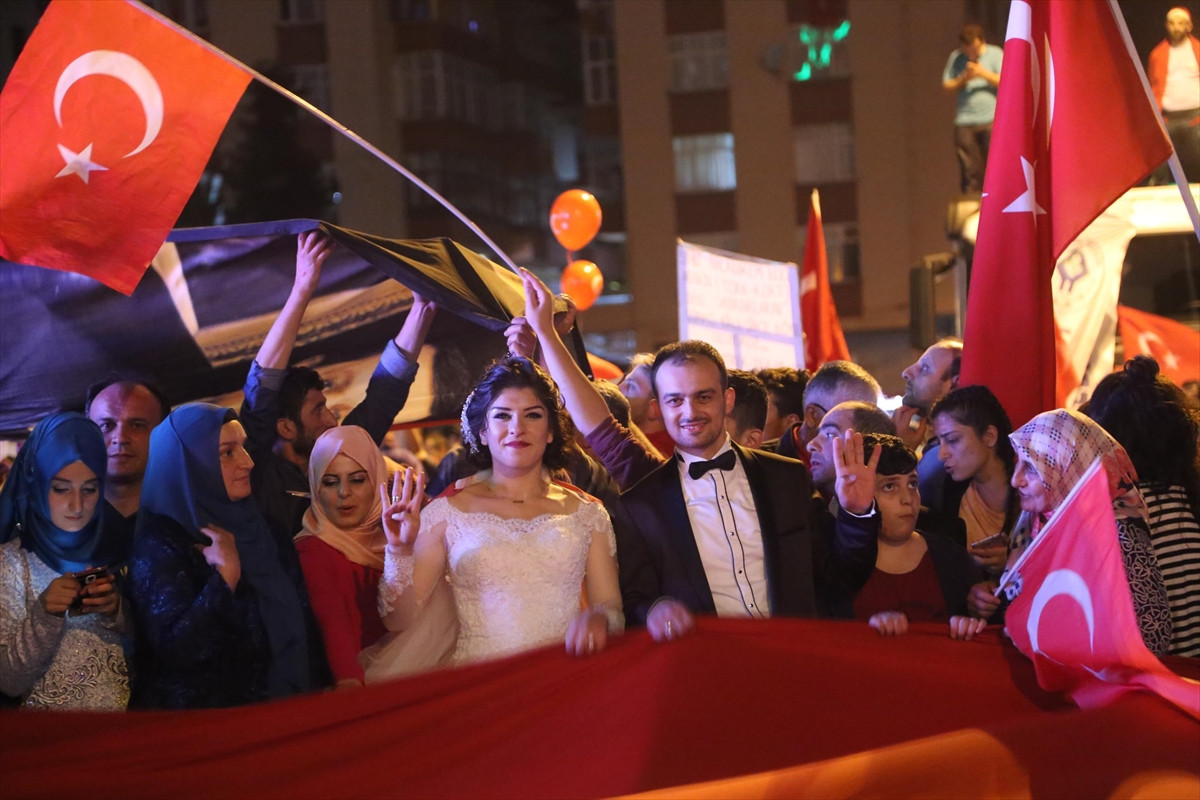 RİZE (AA) - Rize'de yeni evlenen çift, Fetullahçı Terör Örgütünün (FETÖ) darbe girişimine tepki amacıyla tutulan "demokrasi nöbeti"ne gelinlik ve damatlıklarıyla katıldı.