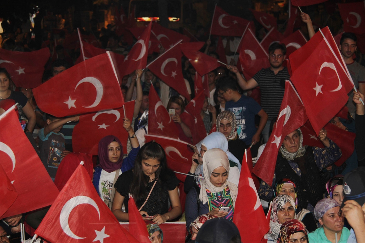 Belediye Meydanı'nda toplanan ve ellerinde Türk bayrakları ile dövizler bulunan binlerce kişi, "Dik dur eğilme, bu millet seninle", "Vatan sana canım feda" sloganları attı. Kur'an-ı Kerim okunduktan sonra darbe girişiminde şehit olanlar için dua edildi.