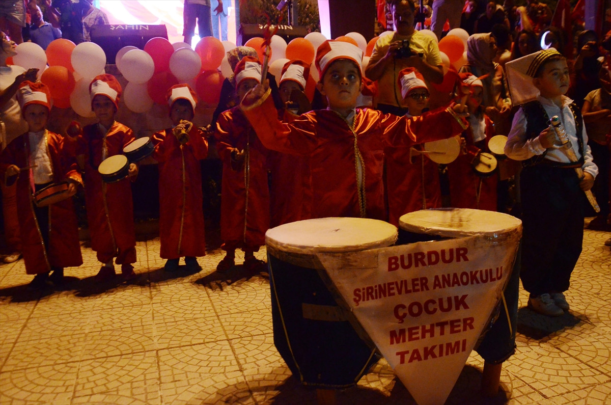 Burdur Cumhuriyet Meydanı'nda ellerinde Türk bayraklarıyla toplanan grup, darbe girişimine tepki gösterdi.