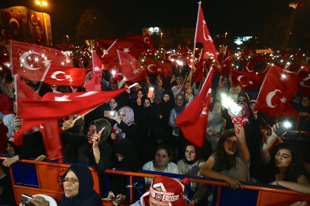 Demokrasi Meydanı'nda ellerinde Türk bayraklarıyla toplanan ve darbe girişimine tepki gösteren vatandaşlar, Cumhurbaşkanı Recep Tayyip Erdoğan lehine slogan attı.