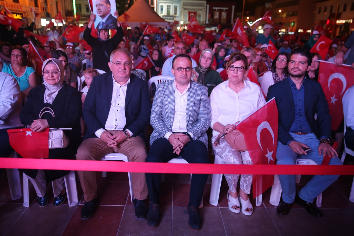 Bu arada demokrasi nöbetinin tutulduğu alana kurulan dev ekrandan Anadolu Ajansı'nın hazırladığı "Dakika Dakika FETÖ'nün Darbe Girişimi" videosu da izlendi.