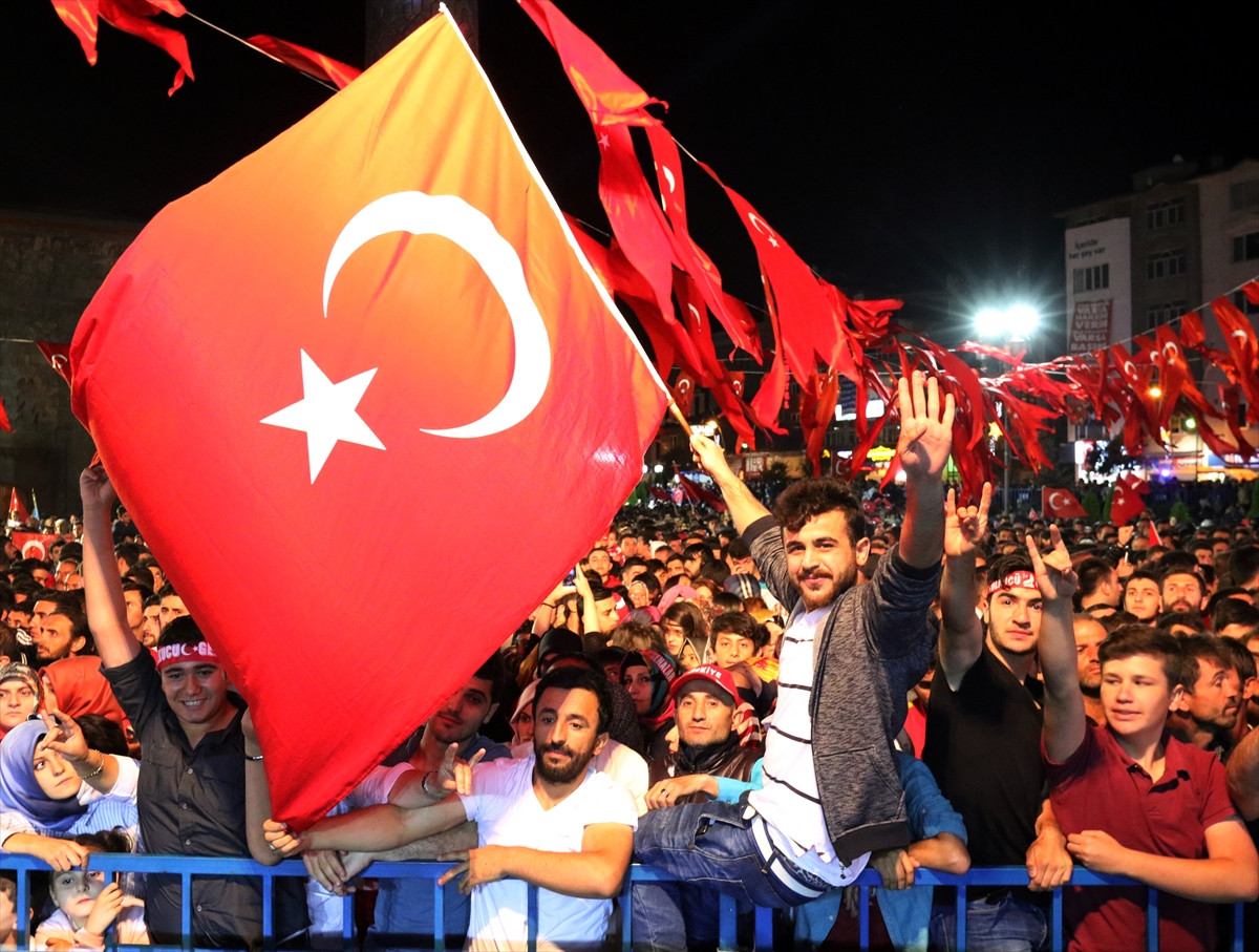 Cumhurbaşkanı Recep Tayyip Erdoğan'ın meydanlara çıkma çağrısına destek veren Erzurumlular, yaklaşık 2 kilometrelik yürüyüşlerinde, "Şehitler ölmez vatan bölünmez", "Ne mutlu Türk'üm diyene" şeklinde sloganlar attı.