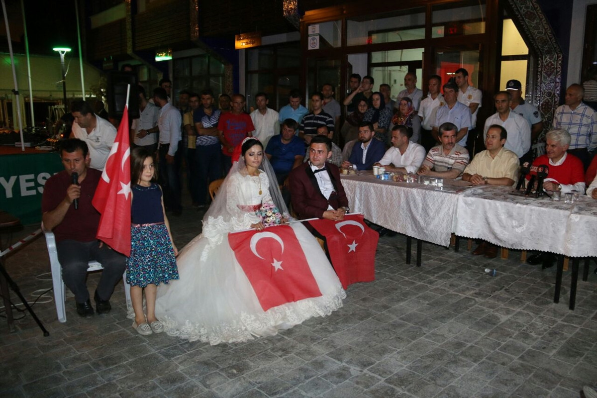 Çifti tebrik eden AK Parti Bursa Milletvekili Hüseyin Şahin, genç çifte mutluluklar dilerken "İnşallah sizler, sizlerin torunları ve hatta onların doksan nesil sonraki torunları bir daha böyle bir darbe teşebbüsü görmezler." diye konuştu.