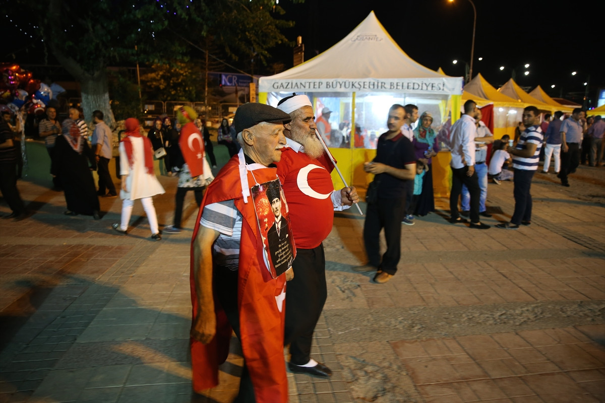 Gaziantep'teki Demokrasi Meydanı'nda toplanan vatandaşlar, akşam namazının ardından ellerindeki Türk bayrakları ve pankartlarla terör örgütünü ve darbe girişimini protesto etti.