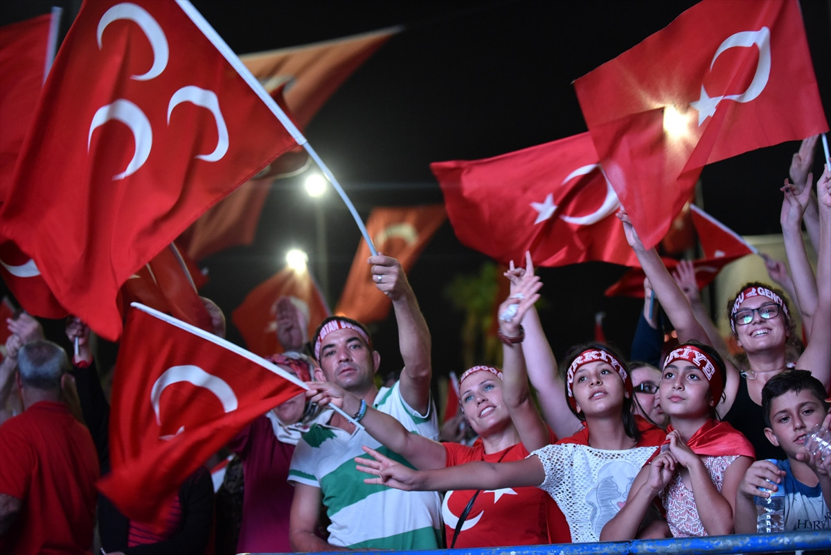 Ellerinde Türk bayraklarıyla çalınan marş ve şarkılara eşlik eden vatandaşlar, alan içerisine kurulan platform aracılığıyla Cumhurbaşkanı Recep Tayyip Erdoğan'ın katıldığı bir televizyon programındaki canlı yayınını izledi.