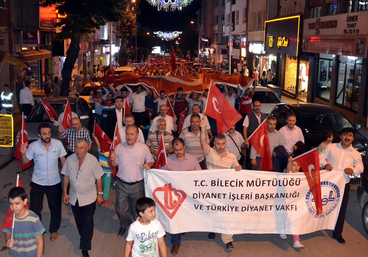 Bilecik'te ellerinde Türk bayraklarıyla Cumhuriyet Meydanı'nda toplanan vatandaşlar, Cumhurbaşkanı Recep Tayyip Erdoğan lehine slogan atarak, darbe girişimini protesto etti.