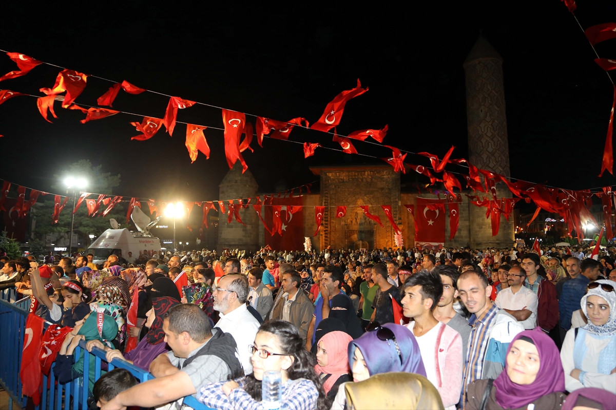 Kentteki Yakutiye Kent Meydanı'nda ellerinde Türk bayraklarıyla toplanan vatandaşlar, darbe girişimine tepki gösterdi. Tasavvuf sanatçıları Ömer Karaoğlu ile Ammar Acarlıoğlu'nun ilahiler ve ezgiler seslendirdiği programda, şehitler için dualar edildi.
