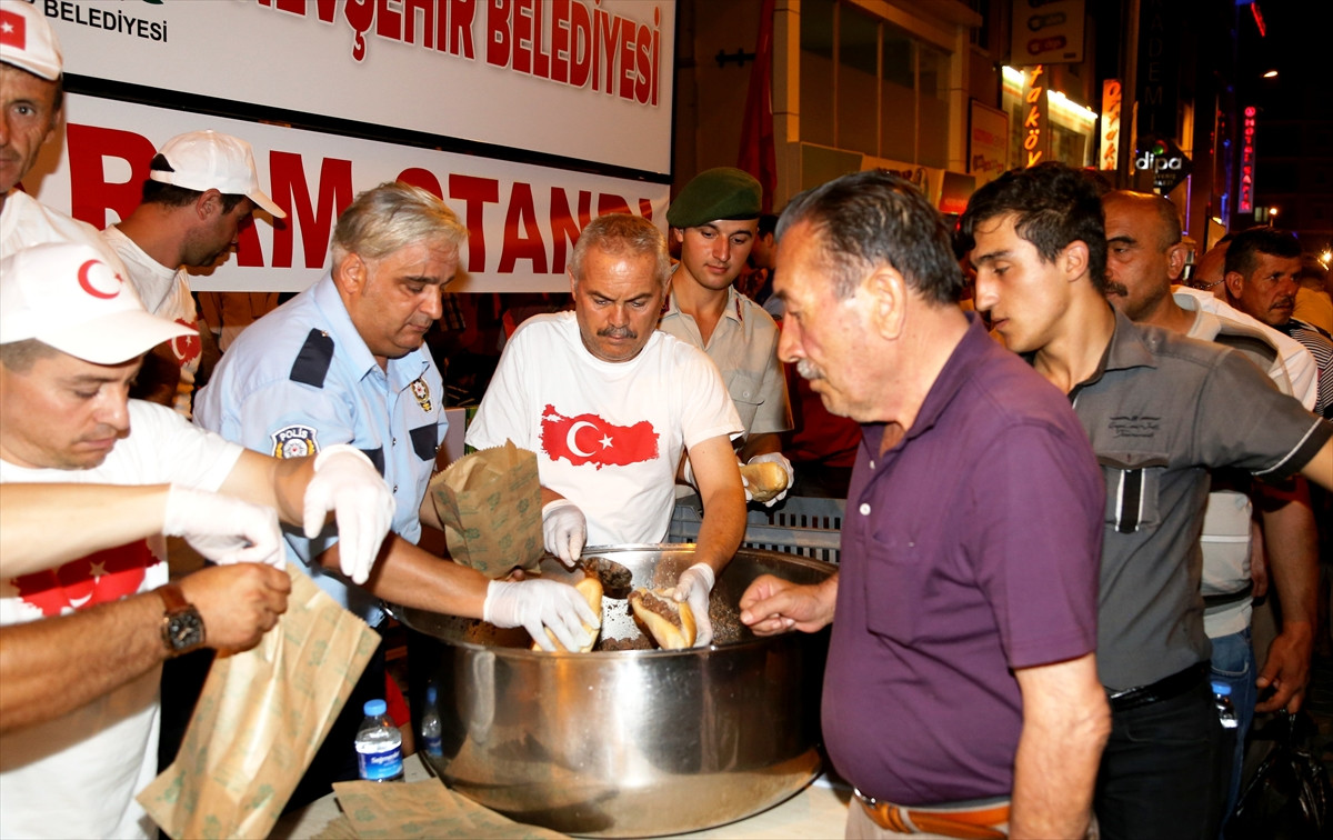 Isparta Belediyesi'nin bayrak dağıttığı meydanda, Kur'an dinleyen vatandaşlar, darbe girişiminde şehit olanlar için yapılan duaya da eşlik etti.