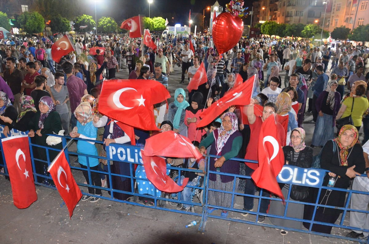 Akşam namazının kılınmasıyla başlayan programda, ellerinde Türk bayraklarıyla meydanı dolduran vatandaşlar, "Dik dur eğilme, bu millet seninle" şeklinde sloganlar attı. Meydanda kurulan platformda Kur'an-ı Kerim ve ilahiler okundu. Vatandaşlara belediye tarafından çeşitli ikramlar yapıldı.