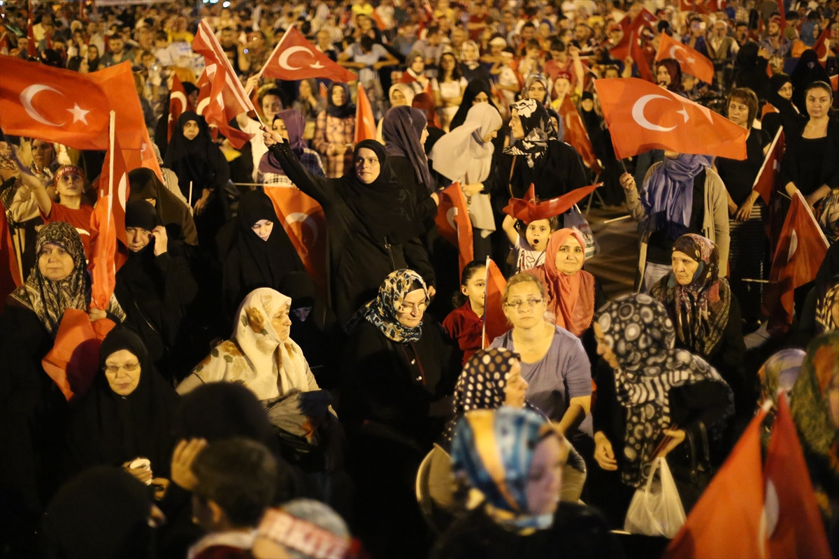 Türk bayrakları, pankart ve dövizlerle meydanı dolduran vatandaşlar, "Dik dur eğilme, bu millet seninle", "Darbeye karşı omuz omuza" sloganları attı.