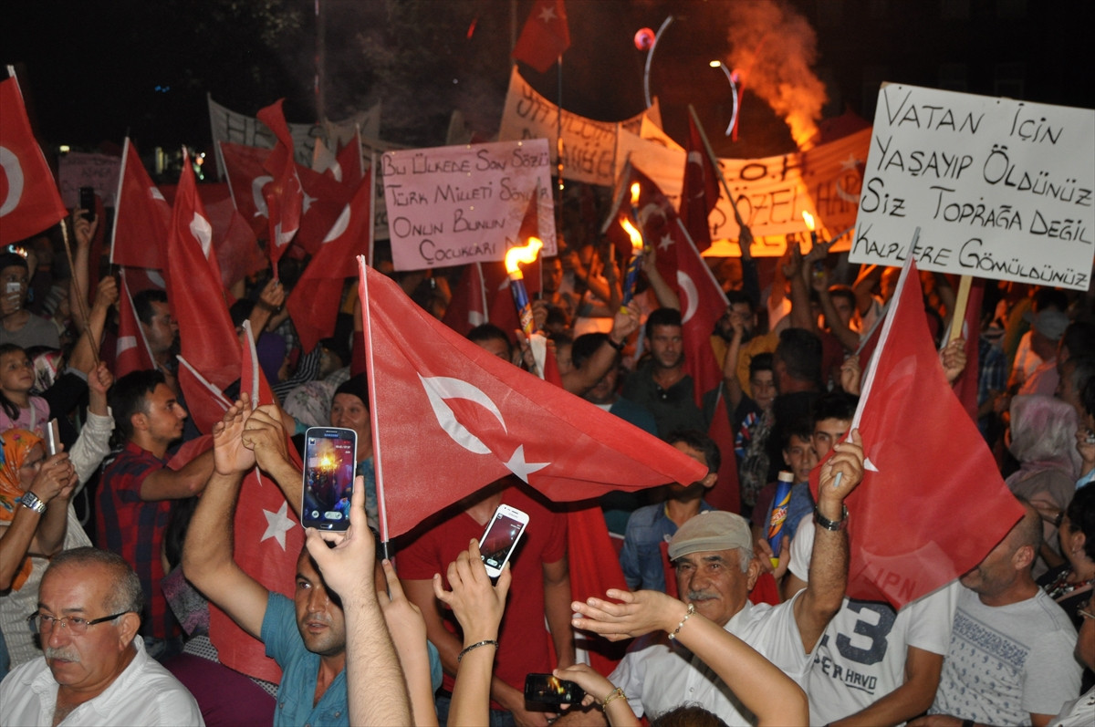 "22 gündür 79 milyonluk Türkiye adeta şunu haykırıyor: Bu vatan bizim, bu vatanı asla böldürtmeyeceğiz. Bu devleti biz yolda bulmadık, bu devleti yıktırmayacağız. Bu ay yıldızlı bayrak, bizim bağımsızlığımızın simgesidir. Bu bayrağı asla indirtmeyeceğiz. Hükümeti biz seçtik, değişecekse onu biz değiştiririz, ey darbeciler siz kim oluyorsunuz."