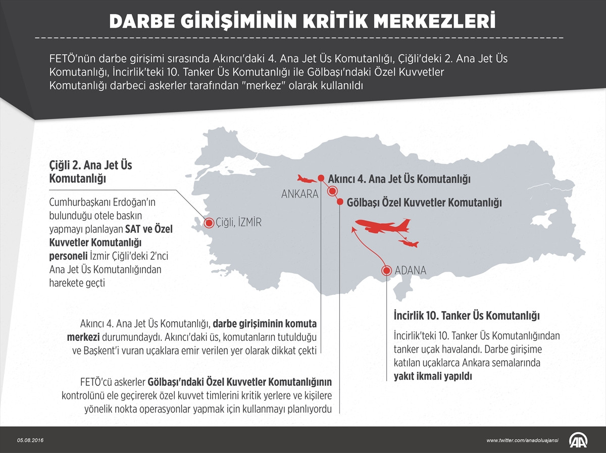 ANKARA (AA) - Fetullahçı Terör Örgütü'nün (FETÖ) darbe girişimi sırasında Akıncı'daki 4. Ana Jet Üs Komutanlığı, Çiğli'deki 2. Ana Jet Üs Komutanlığı, İncirlik'teki 10. Tanker Üs Komutanlığı ile Gölbaşı'ndaki Özel Kuvvetler Komutanlığı, darbeci askerler tarafından "merkez" olarak kullanılmak istendi.